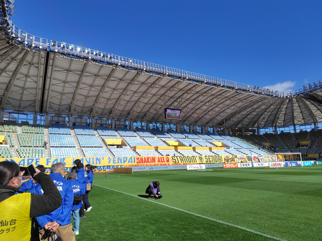 ボランティア活動前にピッチで写真撮影会があった(今期最終戦のため)