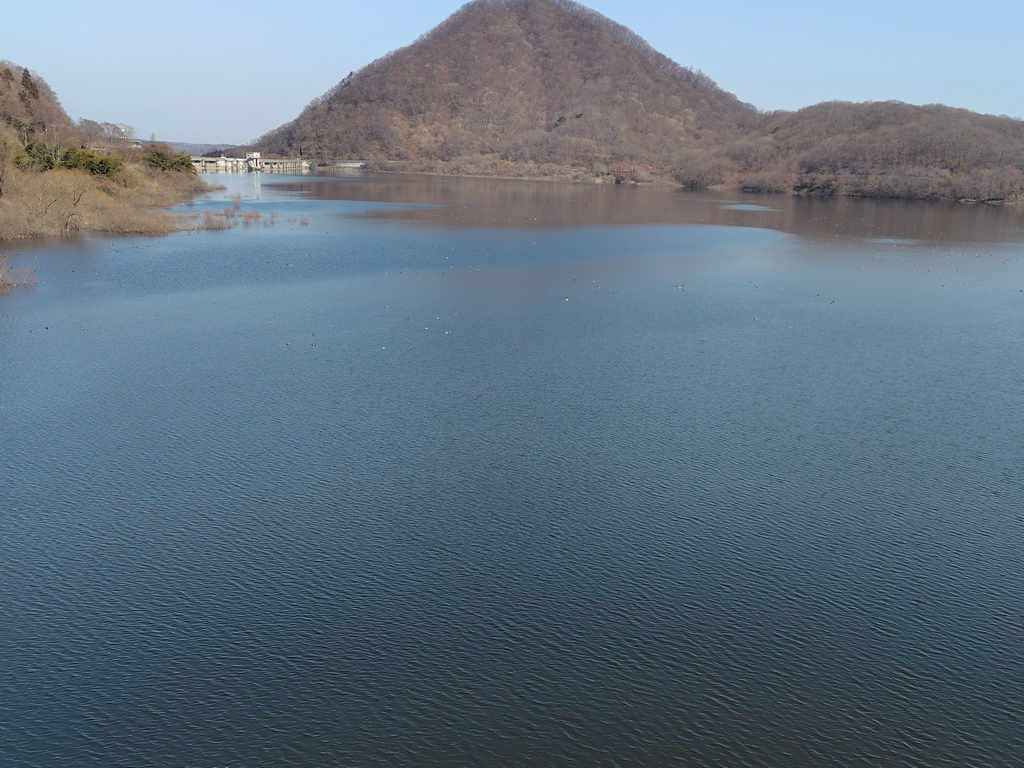 七ツ森ダム(橋の北東側)。湖水は満タン。渇水からは完全に脱していた。