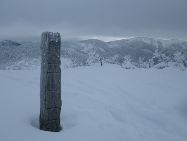 3時間で山頂着。ヤブ漕ぎ、先頭ラッセルなど適度に難儀して楽しいスキー歩きになった。満足満足♪