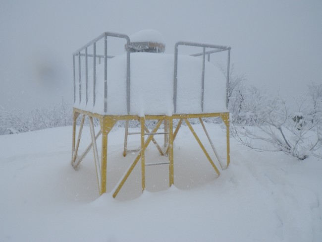 積雪増えて展望台も大分埋まった。2週間前とは大違いである。-4℃、風は弱いが雪は相変わらず。視界も無いのでスルーして先を急いだ。