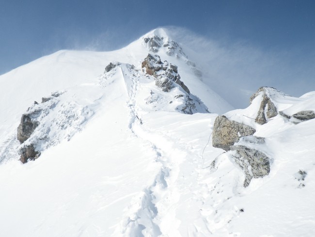 ここでスキーを外しアイゼン歩行に切り替える。下りはスキーで滑る方が安全なのでザックに固定した。ここに来て風が一気に強まったが稜線は更に強いだろう事が雪煙と風音から想像出来る。