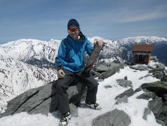 出発から7時間45分で槍ヶ岳山頂。穂先までのアプローチは滑ったら終了のザラメ急勾配で本日の核心部。アイゼン必須の緊張するシチュエーションだった。