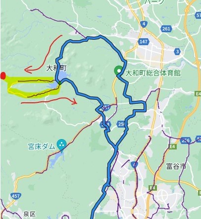 ↑はGarmin connectの地図画面。事前登録は青ライン。途中でルートを離れ(黄色ライン)リルート動作もみてみた。あとは電池の消費など。