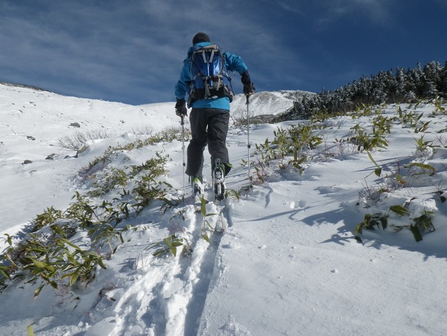 熊笹や岩の露出は多く雪面もクラストしておりスキー滑走は難儀しそうだった。室堂を右に見ながら雪を辿って凹みを登る。山頂に近づくと光るほどテカテカの凍結バーンが現れ右に左に避けながら山頂を目指す。