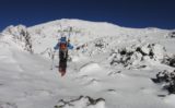 雪煙が舞う予想通りの強風だった。雪が硬くなりクトー装着したが、それでも滑るのと上部では必須明白だったのでアイゼンに履き替え、-15℃強風の中で時間を浪費した。