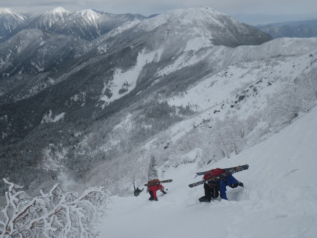 ・森林限界までは進路を見誤るとジャングル地獄に捕まる。地図上の谷を詰めた方がヤブが埋まり確実かも。下山滑走も同様