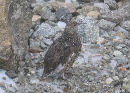と突然、雷鳥(らいちょう)を発見! 登山のブログによく登場する鳥に運よくお目にかかれた。大きさは鳩ぐらい。人をあまり怖がらないがカメラを向けるとちょろちょろと動き回る可愛らしい鳥でした。