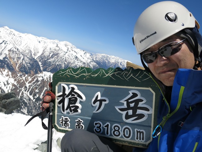 8時間ちょいで穂先登頂。繁忙期は大渋滞のアプローチに人は無くマイペースで登行出来た。雪は適度に柔らかく登り易い。滑落で人生終了でなければサクサク登ってハイ登頂という斜度だが、高所恐怖症の私は足がプルプルの亀野郎と化した。ウィペットはハシゴやクサリで邪魔になると思い2本ともデポしたわけだが、氷壁登行ではダブルがやはり安心である。この時期なら次回からはウィペットのダブルアックスかなぁ。穂先は圧巻の360度パノラマであった。日本標高第5位3180m!