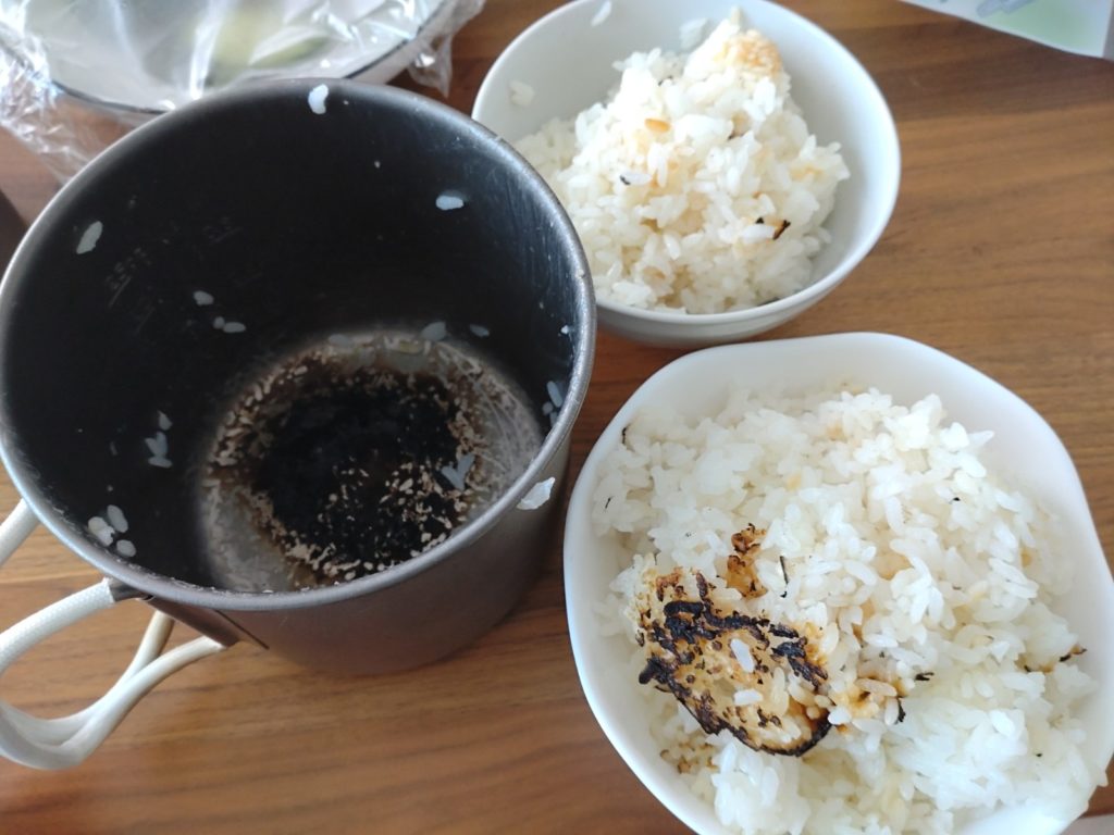 コッヘルの焦げは固着していて、水を入れて沸騰させても浮き上がらなかった。ガリガリこじり取るための金属のスプーンが必要。丁寧に除去しないと次回、焦げが増えそうだ。。