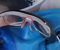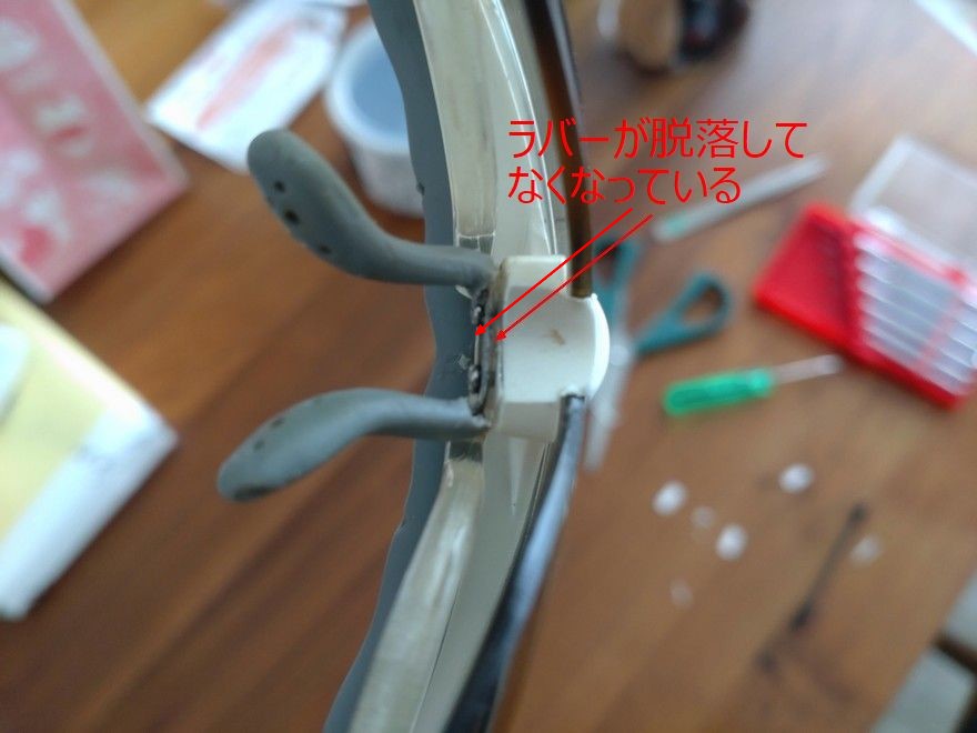 長年の使用で、鼻当てのネジ止め部のラバーが劣化して脱落。ネジをキツく締めても鼻当てがフレームに固定されず、グラグラする状態だった。