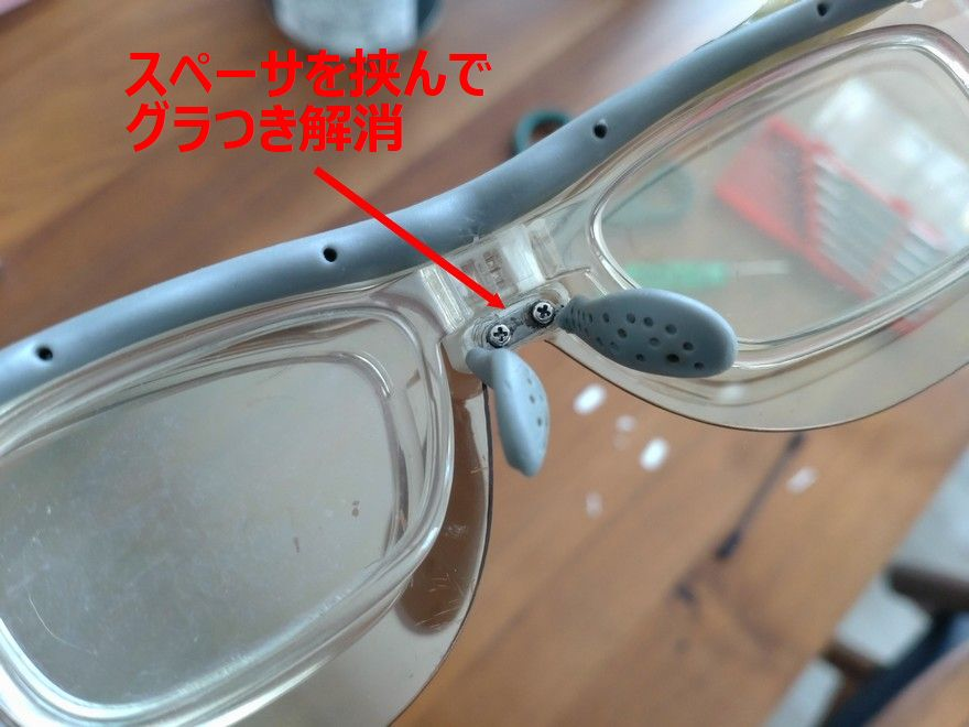 鼻当てとフレームの間にテープを重ね貼りしてスペーサの役割をもたせ、ネジを締めた時に固定されるようにした。