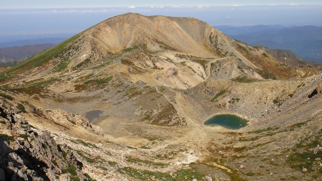 殿ヶ池避難小屋(写真中央)を過ぎると黒ボコ岩までは再び急登となる。振り返ると観光新道の尾根が美しい。
