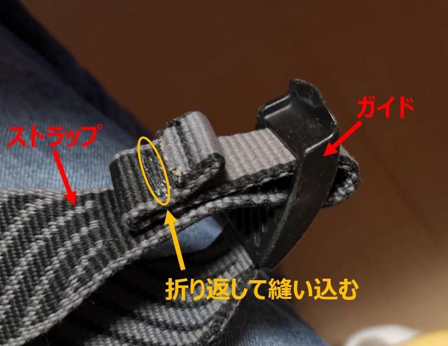 BDのウィペットだが、ガイドからストラップが抜けることが多い。ストラップ端は折り返して縫い込まれており抜け難くなっているが、十分に機能していない。