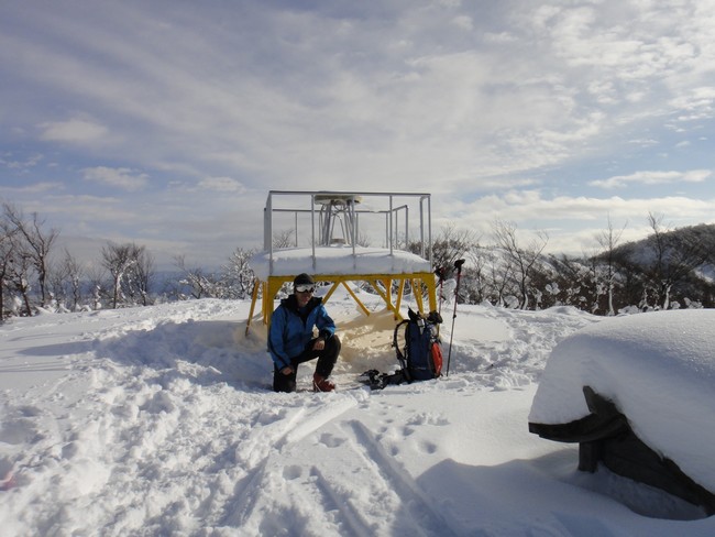 急登で振り返ると金沢市街そして日本海の素晴らしい眺めが飛び込んでくる。新年早々実に気持ちがいい。それにしてもワカン登山者の直登トレースはスキーには急過ぎヤブを掴み上半身で登るの連続だった。時間が掛かり過ぎるため途中からスキーを背負ったが今度はスキーが枝にひっかかりまくり難儀した。