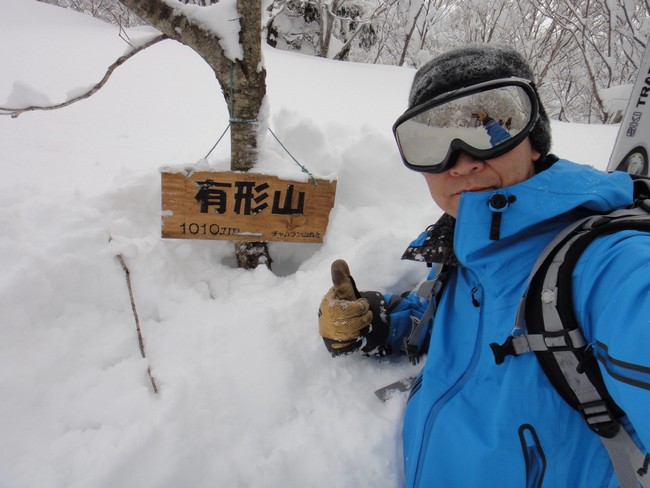 10時5分有形山 山頂 木々に囲まれた猫の額の様な狭い場所だった。眺望も無し。中央の木を少し掘ると予想通り山頂表示が露出したので記念撮影した。 さて軽く食べたらお楽しみタイムである。深雪パウダーを頂きましょう。がしかし。。。
