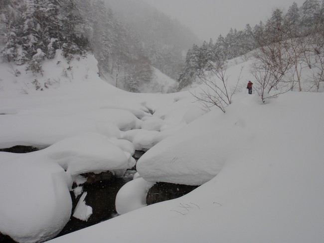 チビ谷以降は両サイドが急になり川辺に下りたり上ったりでペースダウン。この先、槍平までの所要時間は1時間だが蒲田川が埋まっていない状況では難儀間違いない。時間も1時近く、更に帰路は細かなアップダウンのため滑って降りるだけではない等々勘案して今回はここまでとした。