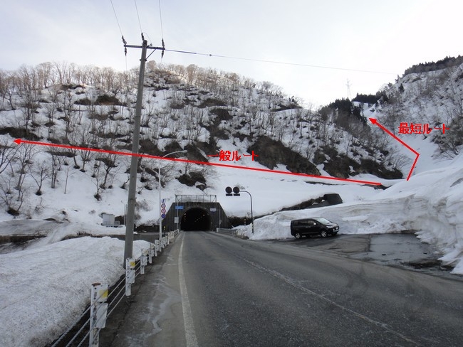 谷トンネルの福井県側出口の空きスペースに駐車。気温は0℃。新雪なく雪は締り硬いのでクトーを装着してスタートする。ネットでは林道にそってトンネルの真上を斜めに登り始めるルートが多いが、沢沿いに登れそうなのでトレースを無視して最短ルートで攻める。