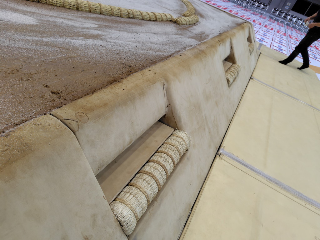 土俵。四辺は土ではなく枠である。土台の上に枠を組み立てて凹を作り、凹の中に土を運び入れ、押し固める。