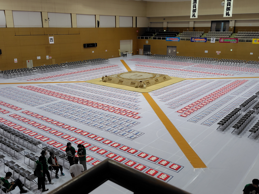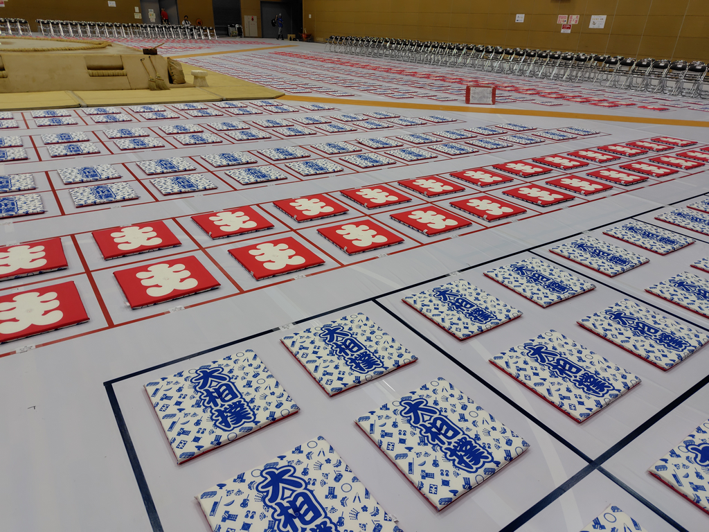 ビニール袋に入っている座布団を出して整列する。しゃがみ作業だったのと、数が数だけに重労働だった。