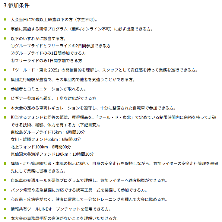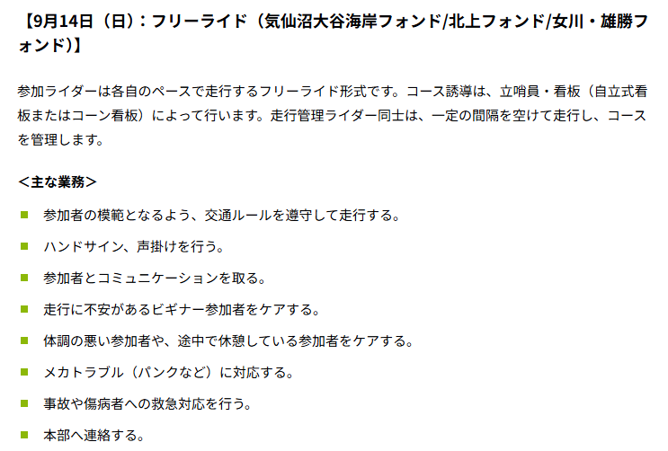 東日本大震災の復興支援と、震災の記憶を未来に残していくことを目的したサイクルイベント「ツール・ド・東北」。初参加は2017年で、この時に走管の存在を知り興味をもった。しかし、本番までに2回の講習会(記憶では)があり、金沢転勤中だった自分には金銭的・家族的なハードルが高く断念した。