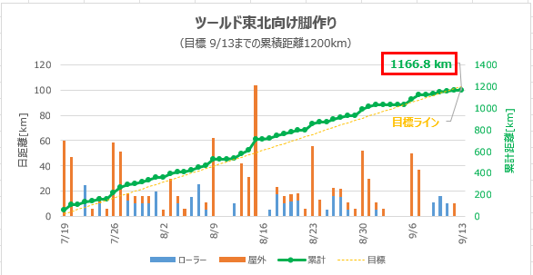 この思いの元、脚作りを2ヶ月前に開始。通勤ライド、ローラー、実走など全て込みで「150km/週」をノルマとし、以下計算から1200kmに目標設定した。