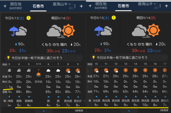 石巻の当日の予報。風は、女川、南三陸、気仙沼いずれも西風5~7m程度で石巻が10mと最も強かった。復路終盤の北上川沿いが試練と予想された。
