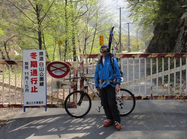 雪解け水と雨で増水した大白川。川の白、空の青、新緑の緑の調和の美しさを感じながら気持ちよくMTBを漕いで行く。林道は融雪が進み路肩の雪も殆ど無かった。