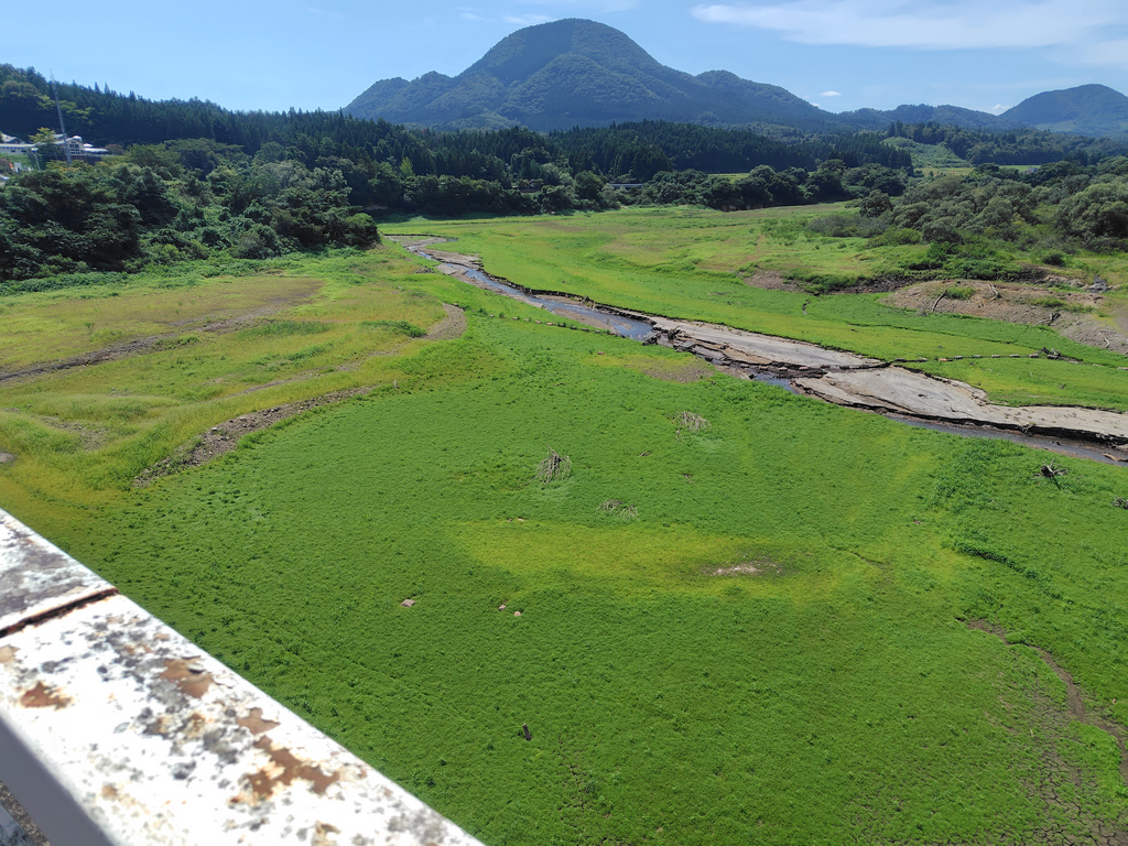 七ツ森ダムの干上がりは変わらず。雨は降ったが多くはなかったので当然だろう。西側の「草原」は緑が濃くなった印象😵💫
