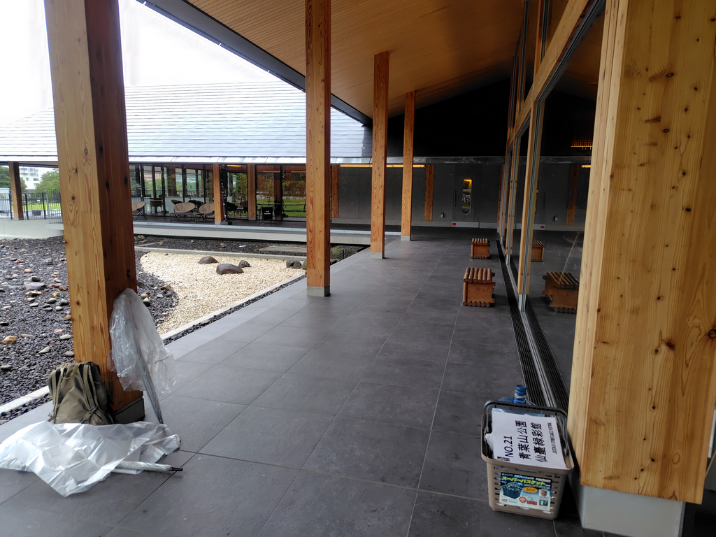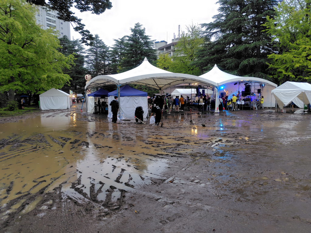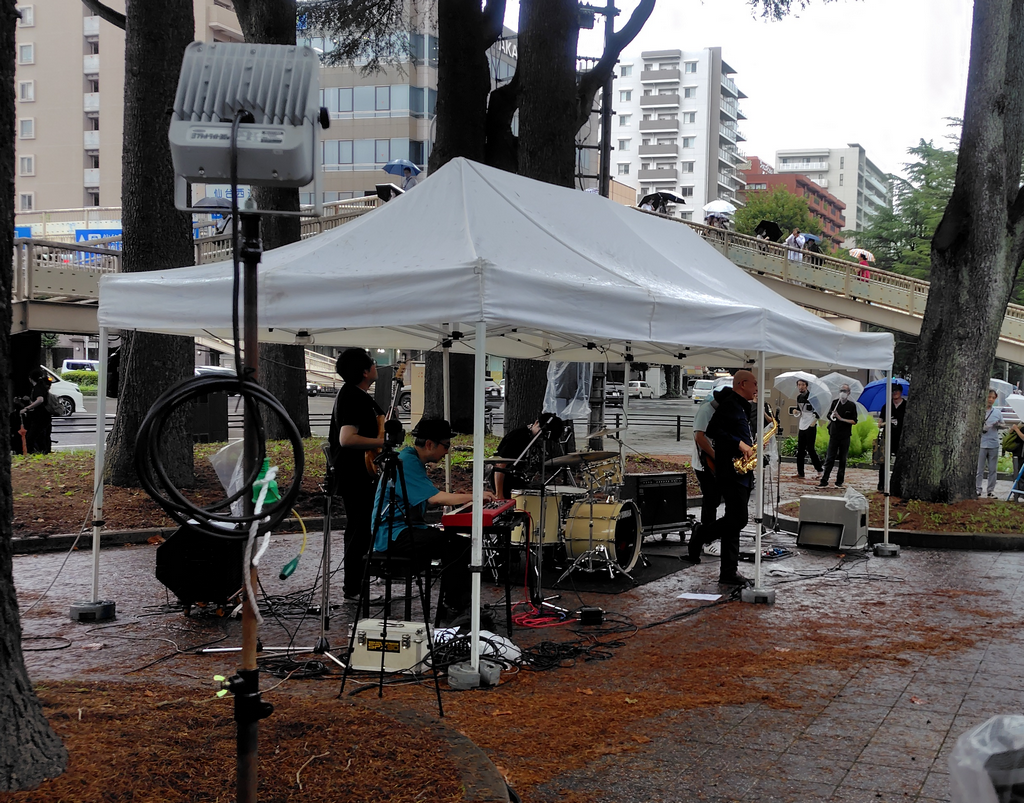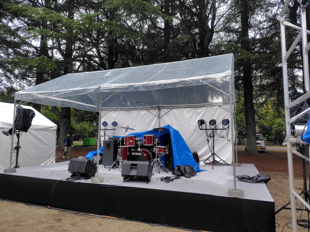 建物内に準備されたテーブルや椅子を並べ、音響設備の設置・配線・テストを行い、パンフレットなども配置。演奏と観客席は当初、東側の軒下と屋根のない庭を予定していたが、雨天のため急遽北側の軒下へ変更。観客も含めて雨をしのげる場所となり、仙臺緑彩館の柔軟な対応には感謝しかない。