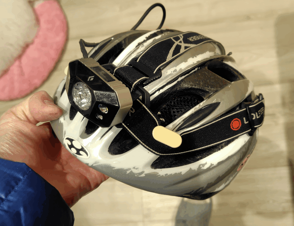 夜中行動のSeaToSummit、300kmブルベ用のヘルメットはヘッドライトを取り付け易く改造してある。久しぶりに使用した^^