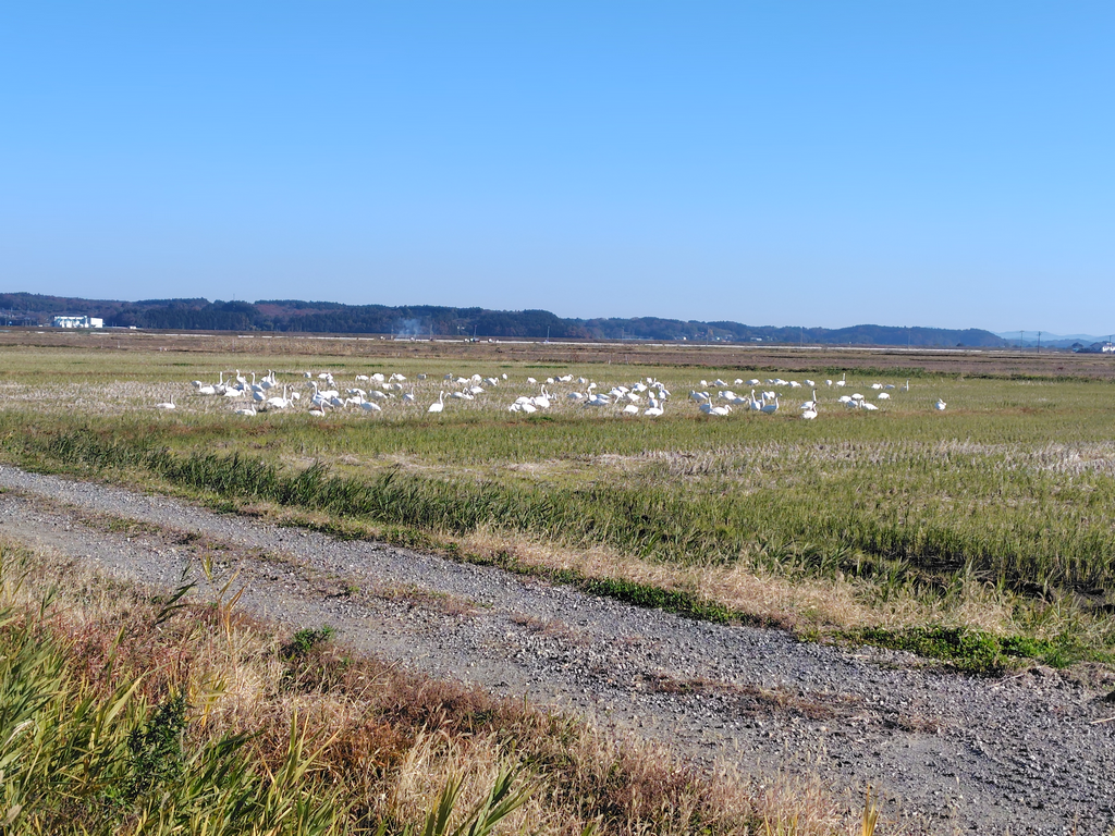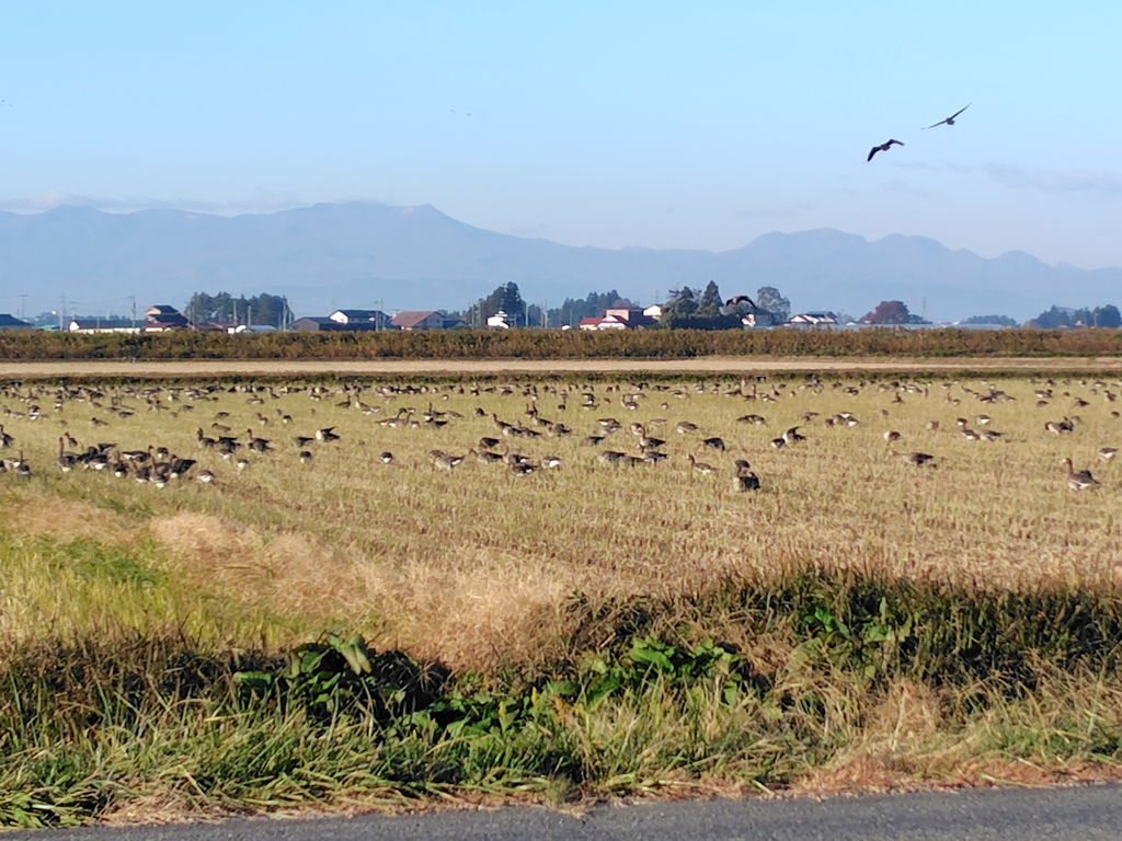 数km離れた田んぼに群れていた。落ちた稲穂や虫などを食べるのだろうか。